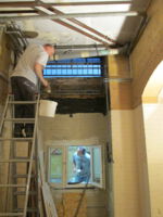 Auf Kalenderblättern sehen hart arbeitenden Männer irgendwie anders aus, weniger textil dafür mehr Schweiß, und so werde ich schnell abgelenkt von den charmanten Räumlichkeiten. Das um 1910 gebaute Gewerbehaus mit der interessant verzierten Steinfassade hat mich schon mit den gekachelten Fassaden in den Höfen erfreut. Der Keller hat zum Teil noch die alten Türen, Rundbögen und gelbe Ziegelwände. Man kann ahnen, wie es vorher hier ausgesehen hat und so entwickelt man schnell einen Blick für die Arbeiten, die schon getan sind: Neue Leitungen sind verlegt und der Doppelsteckdosen-Lagerbestand eines ganzen Baumarktes eingebaut worden, Fußböden und Decken sind neu verlegt bzw gezogen worden, die Malerarbeiten im Gange. Der eigentliche Übungsraum ist erheblich größer als der alte Raum. Ich mache mir allerdings doch ein bisschen Sorgen, denn es gibt kein Fenster und der geplante Abzug scheint mir aufgrund der zu erwartenden 'Nebelschwaden' ein wenig zu klein. Aber auf solche Gedanken kann wohl nur ein Nichtraucher kommen.